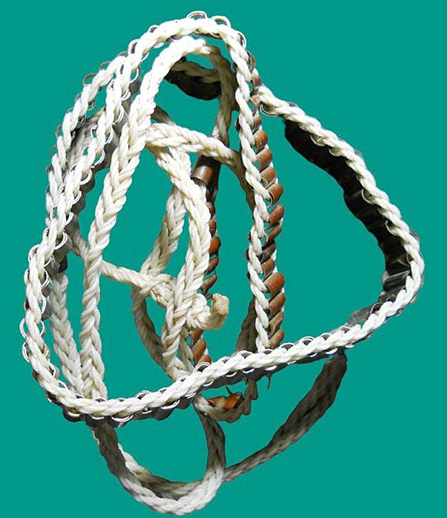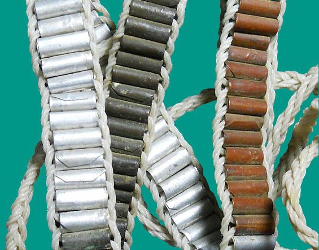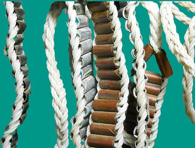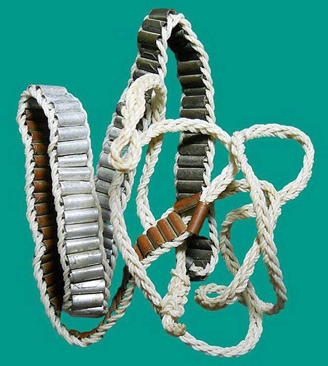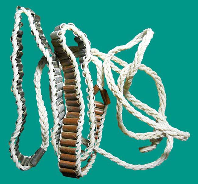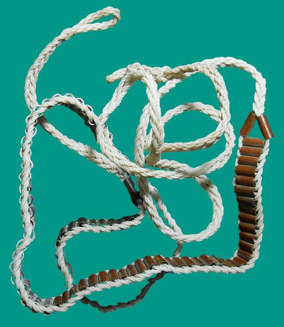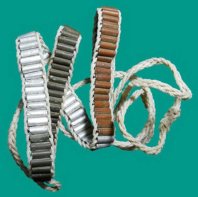 B.E.2519 Dimensions: W 1.2 cm x L 106 cm Materials: copper, yellow bronze and aluminium on white nylon cord Item Ref: ps47539